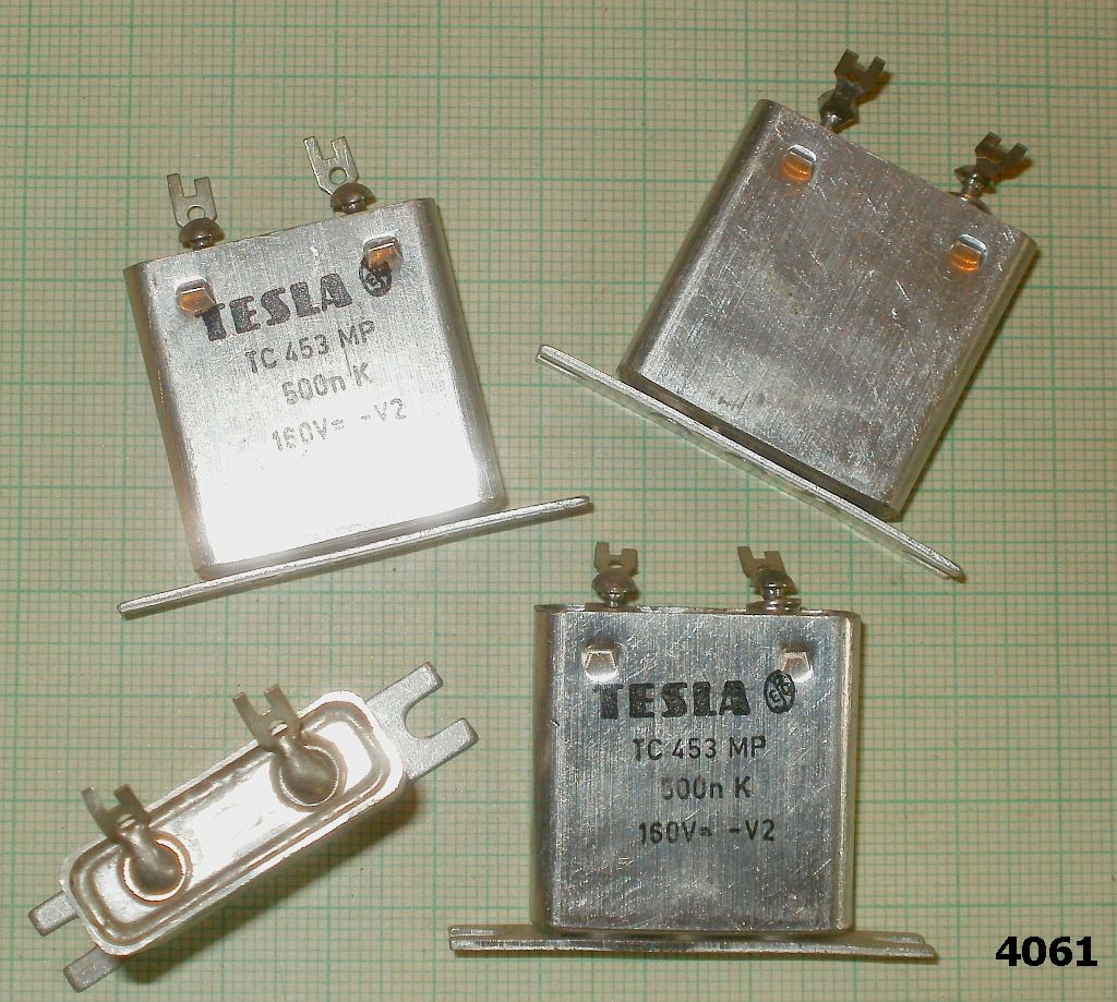 Kondenzátory TESLA TC 453MP (Metalizovaný Papír) s kapacitou 500nF na.napětí 160V.